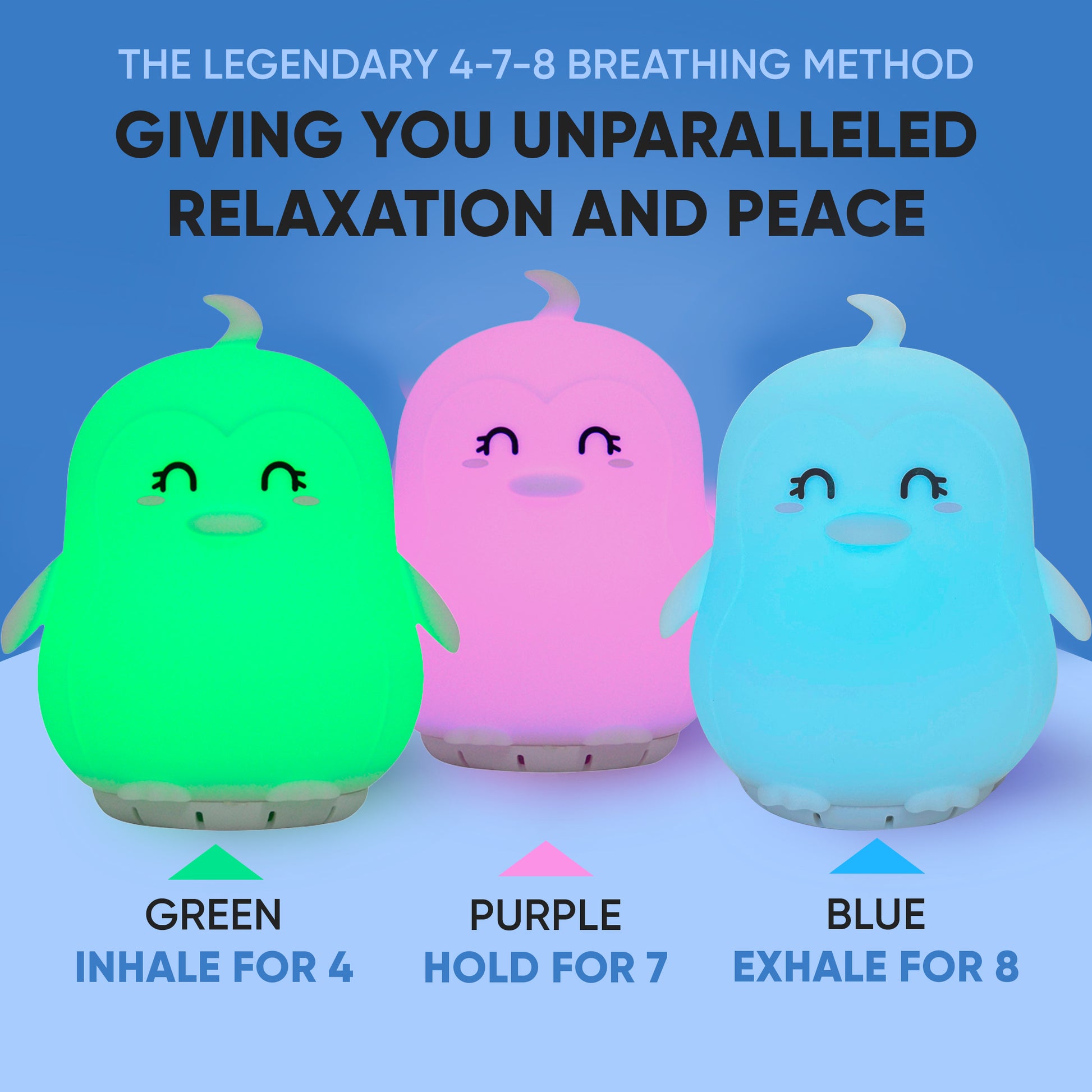 - 4-7-8 Iconic Breathing Method Guide Buddy - Say goodbye to sleepless nights and anxiety with the 4-7-8 Method Guide - the most popular breathing technique for relaxation and better sleep! Inhale for 4 seconds (green light), hold your breath for 7 seconds (purple light), and exhale for 8 seconds (blue light). This pattern activates the body's relaxation response, calms your mind, and promotes a sense of inner peace.